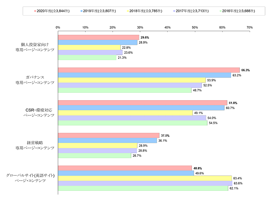 全体の傾向として、掲載率が高かったのは「ガバナンス」66.3%の専用ページ・コンテンツが最多。以下「CSR・環境対応」61.8%、「グローバルサイト(英語サイト)」48.8%がそれに続く。前年との増加を比較すると、「ガバナンス」は前年比プラス3.1ポイント、「CSR・環境対応」は前年比プラス1.1ポイント、「経営戦略」が前年比プラス0.9ポイントと伸びている。なお2次評価対象企業に限定すると、「個人投資家向け」の掲載率が前年比プラス2.4ポイントの70.3%と大きく伸長した。