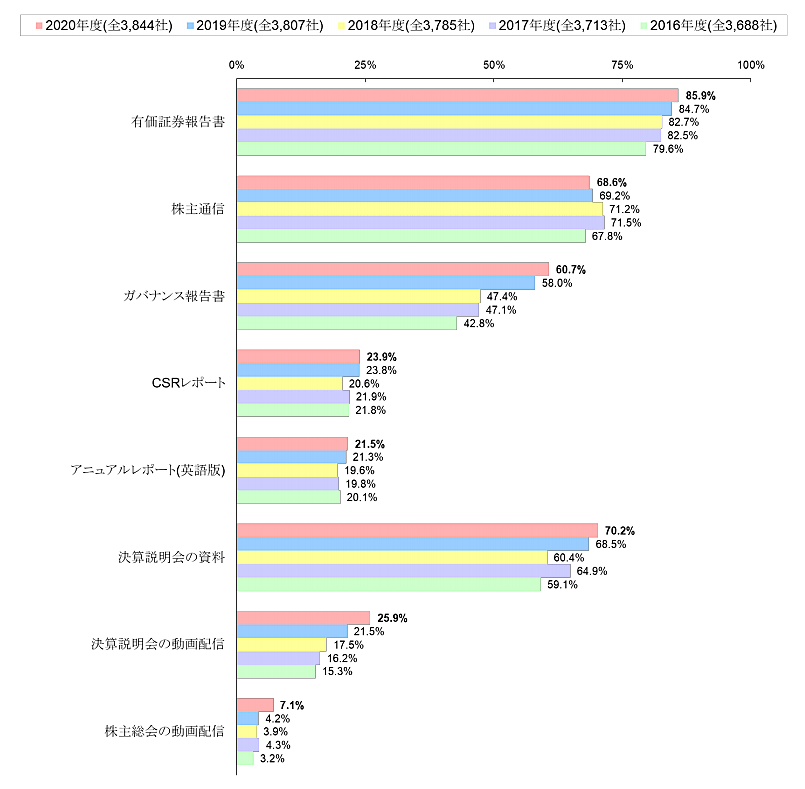 IR関連の傾向としては、「決算説明会の動画配信」が前年比プラス4.4ポイントの25.9%、「株主総会の動画配信」が前年比プラス2.9ポイントの7.1%と上昇した。コロナ禍により代替手段としてライブ配信・動画配信が普及したと思われる。