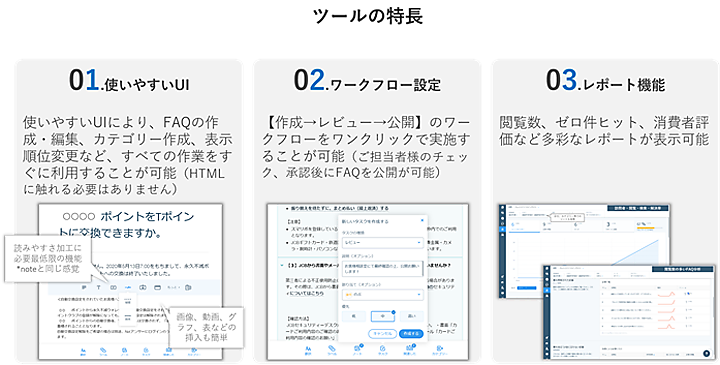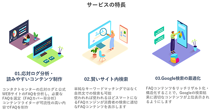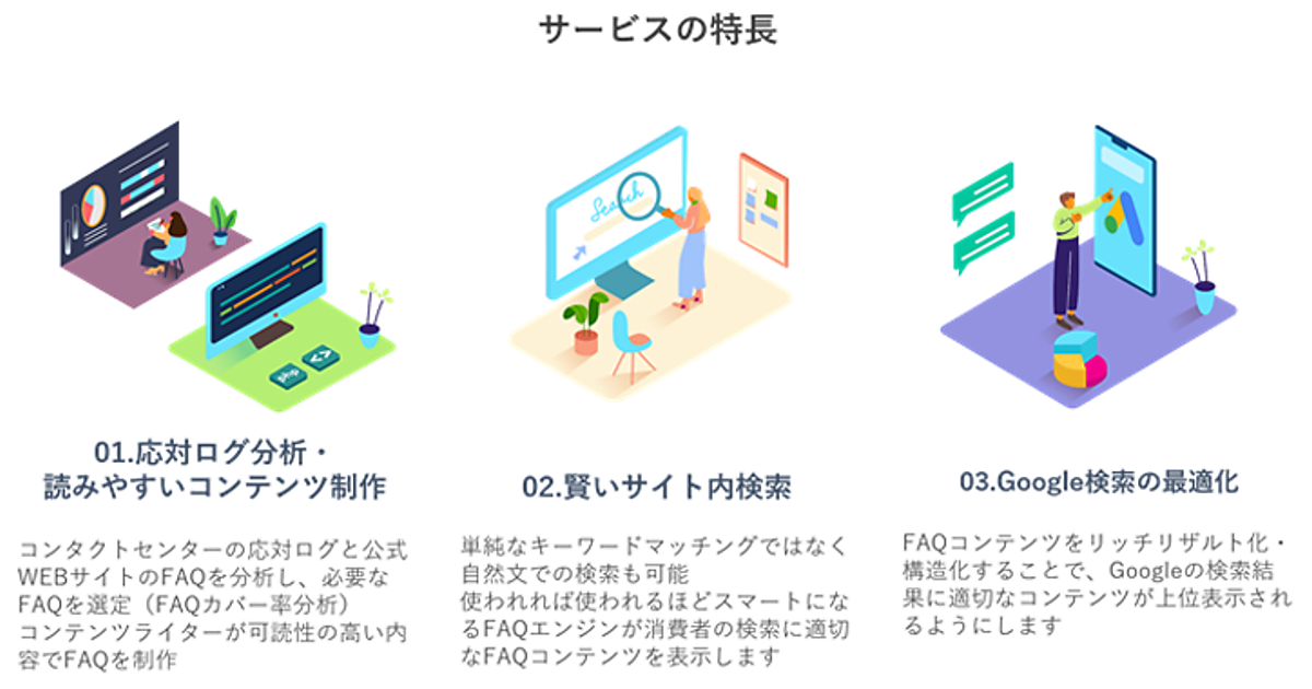 ナレッジ(知識・知見)マネジメントサービスで提供していたFAQコンテンツ制作や分析、レポートに加えて、Webページを記述するHTMLで書かれた情報を検索エンジンに理解しやすいようにタグづけする「FAQページの構造化」からSEO対策まで提供する。初期環境構築▽FAQコンテンツの制作▽導入サポート▽導入後の運用改善提案を行い、専用クラウド型ツールの直感的なUI(ユーザインタフェース)で構造化とコンテンツ制作ができる。