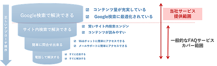 消費者がスマートフォンで検索して適切なFAQコンテンツが上位に表示される理想的な検索体験を実現する。自然文での検索が可能なFAQエンジンを搭載しているので、消費者の検索に適切なFAQコンテンツを表示でき、入力中の文字列から回答候補を表示するサジェスト機能もある。公開したFAQが利用されず電話での問い合わせが減らなかったり、どのFAQを作成・修正・削除すべきか判断がつかなかったりする企業の課題を解決する。