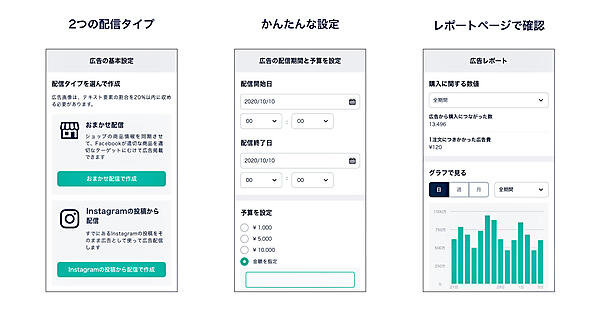 おまかせ配信は、選択した商品でも全商品でも配信可能。FacebookやInstagramで取得したユーザーデータから関心のあるユーザーに広告が表示されるので、潜在顧客にリーチできる。Instagramの投稿から配信は、商品紹介やイベント告知など認知拡大や集客に向いている。BASE加盟店は8項目程度の設定で広告配信でき、効果測定もできる。