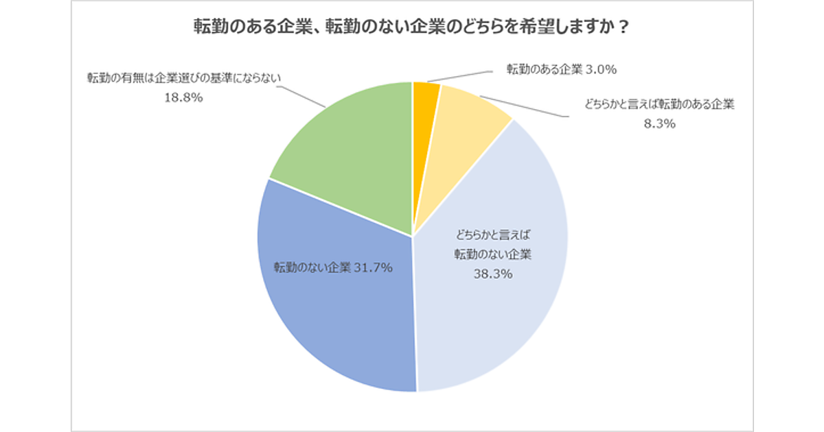 まず「転勤のある企業と、転勤のない企業のどちらを希望するか」を聞くと、「転勤のない企業」31.7%、「どちらかと言えば転勤のない企業」38.3%で、計70.0%が転勤のない企業を希望していた。一方、「転勤の有無は企業選びの基準にはならない」も18.8%と、一定数存在した。