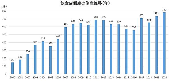それによると、2020年(1月~12月)における飲食店事業者の倒産は、過去最多の780件だった。2000年代における推移を見ると、2005年以降上昇傾向が続いていたが、2011年の688件をピークに減少、2016年には557件まで回復したが、翌2017年より倒産が再度増加していた。こうした傾向にコロナ禍がさらに打撃を与えた形だ。