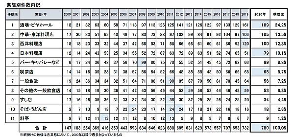業態別では「酒場・ビヤホール」189件(構成比24.2%)が最も多く、以下「中華・東洋料理店」105件(13.5%)、「西洋料理店」100件(12.8%)、「日本料理店」79件(10.1%)が続く。酒場・ビヤホールのほか、日本料理店と喫茶店は、過去最多の倒産数を記録している。