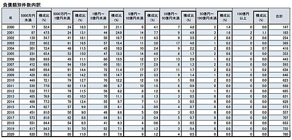 また負債規模別で見ると、「5,000万円未満」が620件(構成比79.5%)で最多となっている。5,000万円未満規模の倒産は、2015年以降8割超を占めていたのが、構成比では今回8割を切ったが、件数では過去最多の620件となっており、中小規模の苦戦がここ数年続いている状況に大きな変化はないと言える。