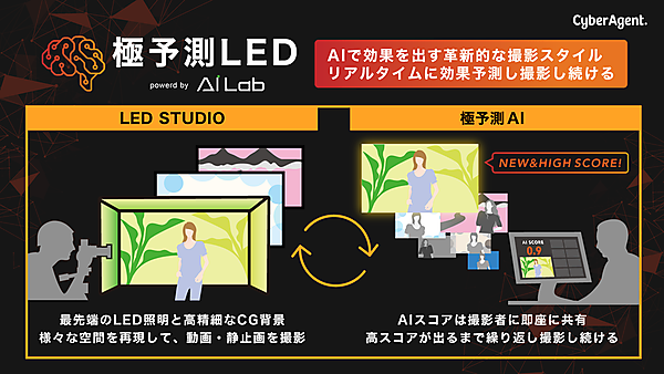 インターネット広告事業のサイバーエージェントは、広告効果の高い動画や静止画などのクリエイティブ素材をAI(人工知能)でリアルタイムに効果予測しながら撮影し続けるプロセス「極予測LED(キワミヨソクエルイーディー)」の提供を1月に始める、と1月13日発表した。さまざまなアイデアを迅速に試しながら撮影することで、広告効果の高い素材ができる。