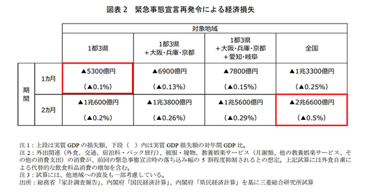 三菱総合研究所は、緊急事態宣言の再発令によるGDPの損失額を試算した。2021年1月7日に1都3県(東京・埼玉・千葉・神奈川)を対象に、緊急事態宣言が再発令され、飲食店の営業時間短縮や、外出自粛、企業へのテレワーク実施などが要請されているが、三菱総研では、複数のシナリオを設定し、追加的な経済損失額を算出している。