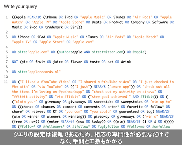 ソーシャルメディアデータを分析・活用する企業が増える一方、データには分析対象として必要のない要素や部分(ノイズ)も多く含まれ、ノイズを除去するためにクエリを設定する。クエリはデータベースからデータを抽出・操作する処理の命令で、設定に知識と手間がかかることから、ソーシャルメディア分析の障壁になっていた。