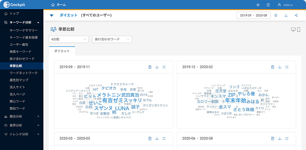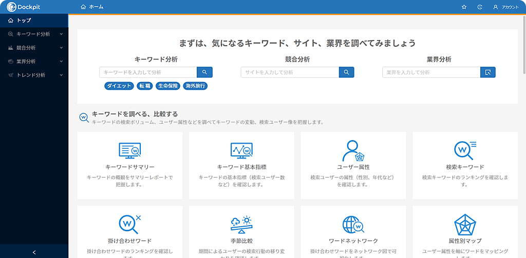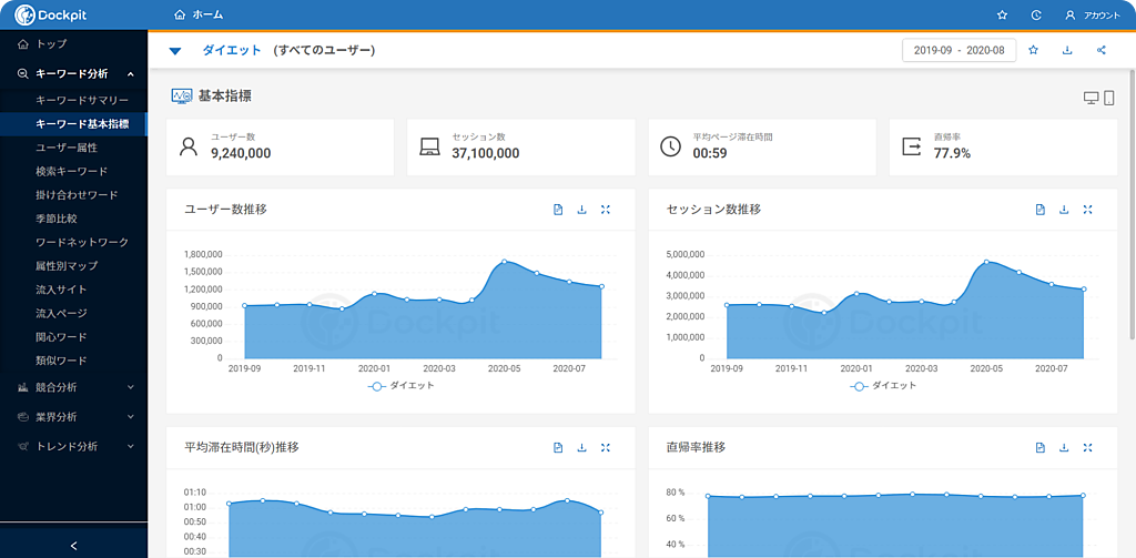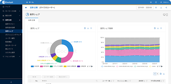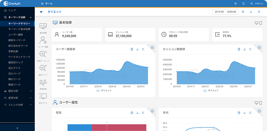 Dockpitは、ヴァリューズが保有する使用許諾を得た消費者モニター会員250万人のパネルのWeb行動ログデータを使い、分析したいキーワードやサイトURL、業界を入力するだけで3C調査ができる。直感的なUI(ユーザインタフェース)を採用したダッシュボードはレスポンシブ対応で、スマートフォンでいつでもどこでもマーケティング分析ができる。