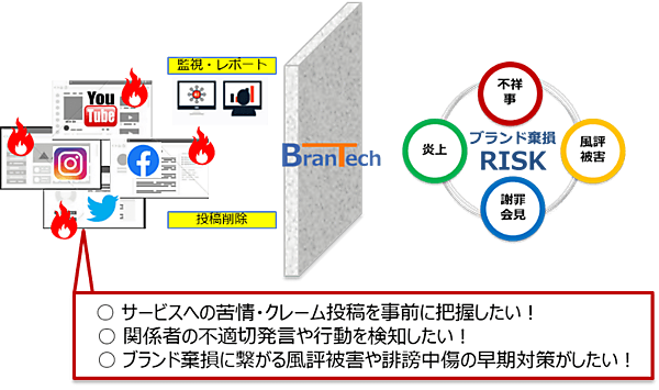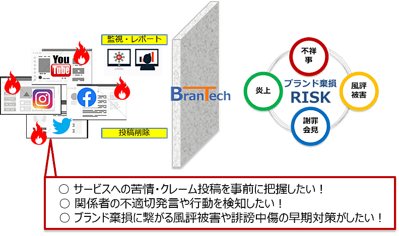 BranTechは、数分の簡単な初期設定で導入でき、リスクのある投稿を自動的に検知するシステムと熟練スタッフの目視によって、高い精度で炎上リスク判定する。休日を含めて24時間365日体制で全件人的目視で監視し、前日監視件数を毎日午前7時から8時に日報メールで報告する。警察へ通報するレベルの投稿を検知した時は電話で緊急連絡する。