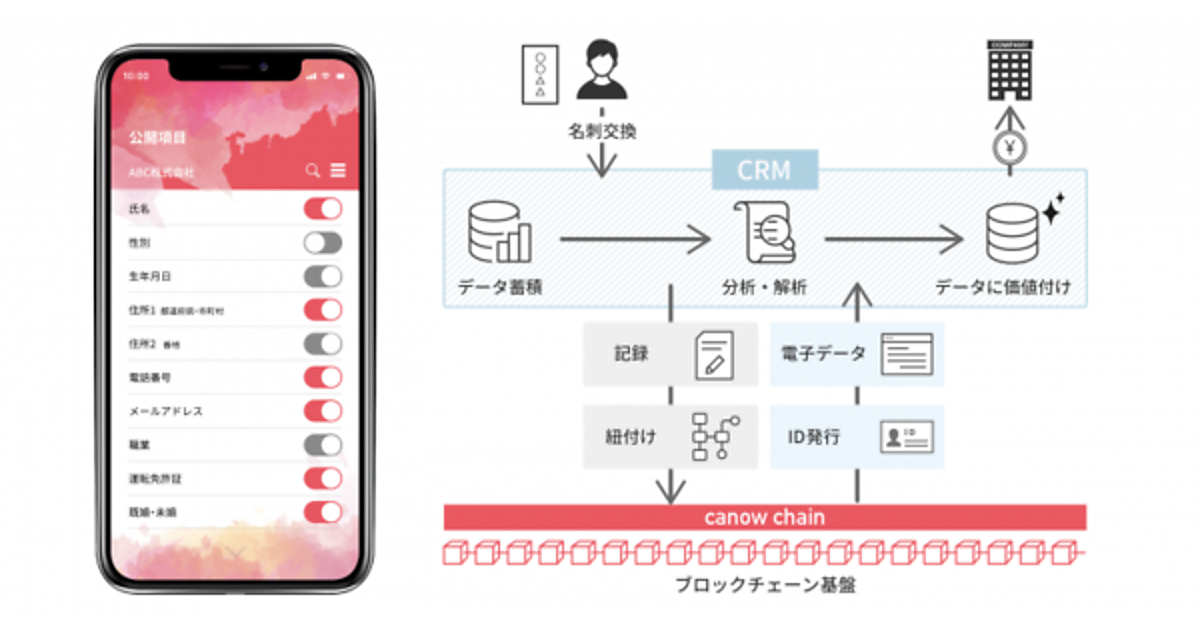 canowは、ブロックチェーンを活用したIDの「DID」と、分散型ID活用データプラットフォーム「Di-DaaS(DID as a Service)」を開発・運営している。DIDは渡し手と受け手間の合意の上で情報交換する特徴があり、相手やニーズによって渡したい情報を出し分ける名刺交換・管理システムを開発する。名刺がデジタルIDカード(DID)の1枚になり、名刺交換を「配る」からDIDを「かざす」にする。