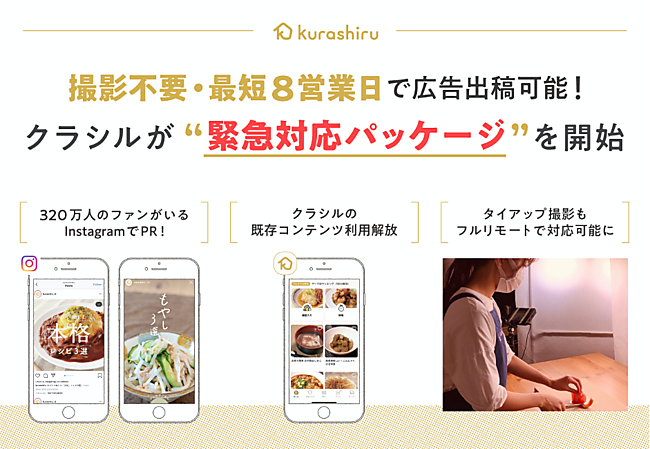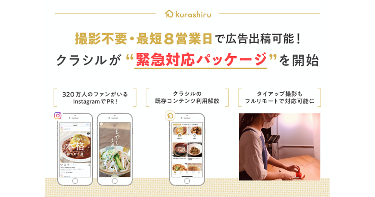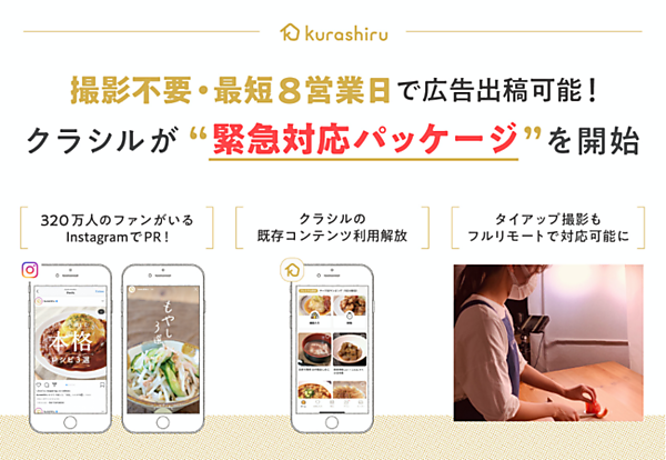 緊急事態宣言の再発令でクラシルの利用者が首都圏と関西で増加し、内食需要が再び高まっている。特別広告パッケージは、「早く広告を打ちたいがクリエイティブが間に合わない」「打ち合わせや撮影立ち合い、確認ができない」などの課題に応えて、撮影不要で実施できる。Zoomなどのオンライン会議サービスを活用した撮影確認と進行にも対応したので、通常のタイアップ動画の撮影も従来と遜色のないクオリティで制作できる。