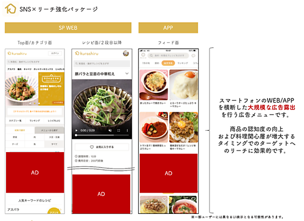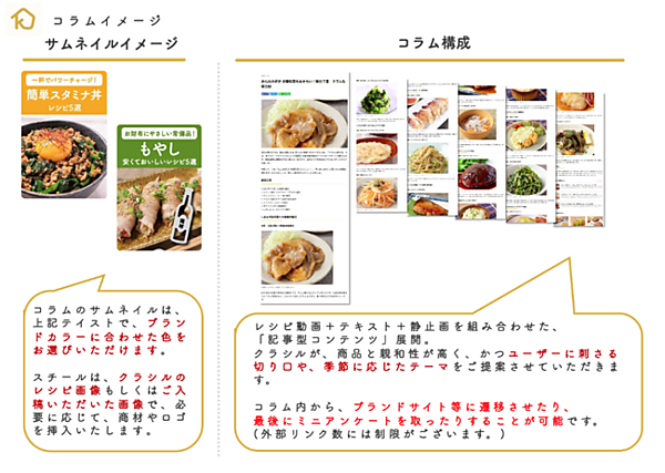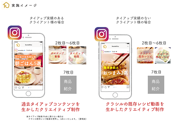 特別広告パッケージは、①クラシルの既存コンテンツ(レシピ)を活用して商品サイトなど希望先に遷移する「Instagramフィード&ストーリーズ配信」、②クリエイティブをクラシルが制作して広告感のない訴求の「SNS×リーチ強化パッケージ」、③商品理解とブランド訴求で記事コラムとアンケートのある「レシピ集コラム&ユーザーアンケートパッケージ」――の3種類を用意した。