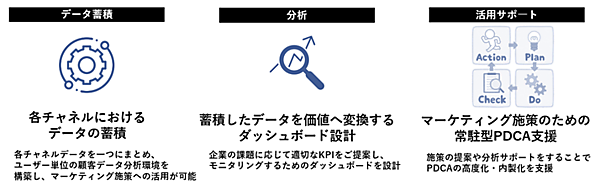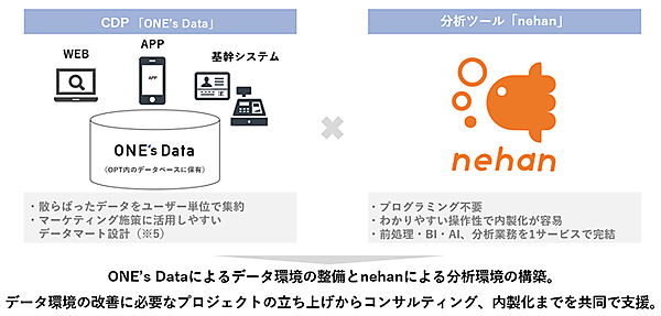 オプトは、顧客の属性データと行動データを収集・蓄積・統合したCDP(カスタマーデータプラットフォーム)の「ONE's Data」を活用して40社以上にマーケティング戦略構築のコンサルティングと実行を支援してきた。今回の連携でオプトのONE's Dataと分析ツールのnehanによる共同支援が提供できる。分析ツールがCX向上に着目したオプトの「CX改善サービス」の起爆剤となり、顧客起点のデータ基盤と分析環境が構築できる。