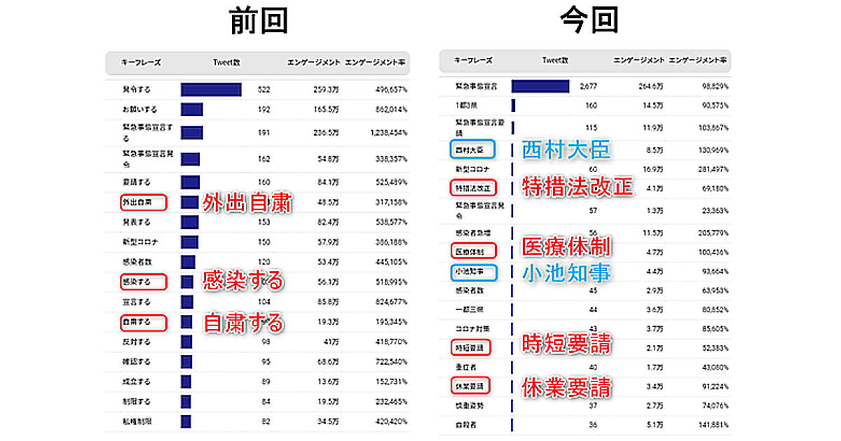 ツイート数が多かったキーワードでは、前回は「外出自粛」「感染」「自粛」など病状や生活に関するものが多かったのに対し、今回は「西村大臣」「特措法改正」「医療体制」「小池知事」「時短要請」「休業要請」など政府や都の対策に対する批判が相次いだ。