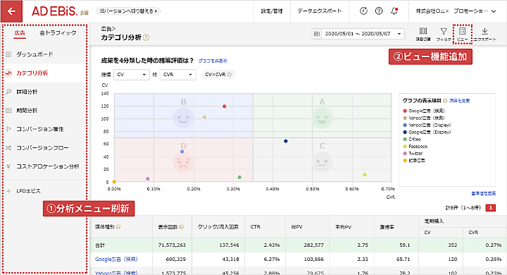 初の全面リニューアルでユーザー導線を再設計し、機能を20以上追加した。分析メニューを画面上部から左へ移動し、複雑な集計対象をタブで切り替える。集計期間や集計軸、フィルターなど分析メニューの共通機能は固定位置に表示。よく使う分析条件を保存するビュー機能を加え、進捗管理とデータ分析のアシスト機能をダッシュボードに追加した。