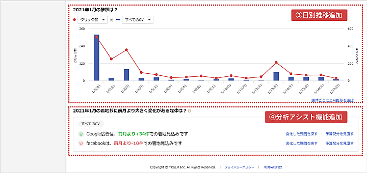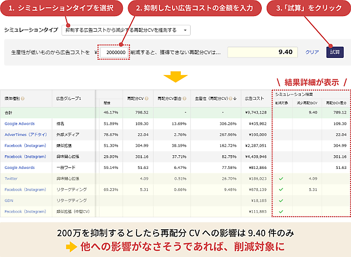流入数やコンバージョン数の日別推移が確認できるようになり、前月と当月の着地見込みを比較して大きな変動があれば知らせるので、変化の大きい媒体の配信強化や予算の見直しができる。シミュレーションタイプを選択するだけでコスト削減成果の影響度が可視化でき、予算削減対象広告をピックアップすることもできるようになった。