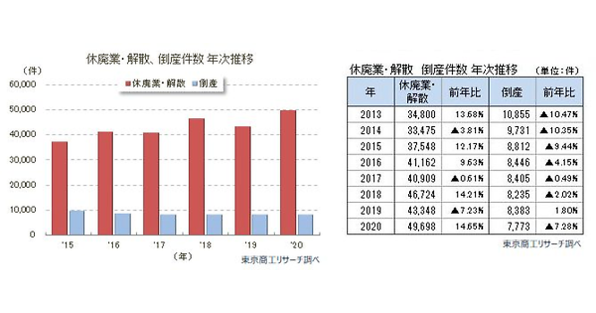 2020年の休廃業・解散は4万9,698件で前年より増加、倒産は7,773件で減少