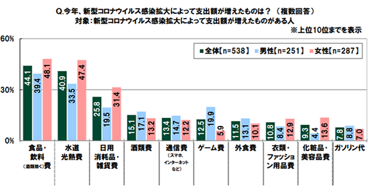 全体の増えた支出は1位「食料・飲料(酒類を除く)費」44.1%、2位「水道光熱費」40.9%、3位「日用消耗品・雑貨費」25.8%、であった。男女別にみると上記の「食料・飲料(酒類を除く)費」「水道光熱費」「日曜消耗品・雑貨費」は女性が上回っているが、「酒類費用」「ゲーム費」「外食費」は男性が上回った。特に「ゲーム費」は特段差がついた。