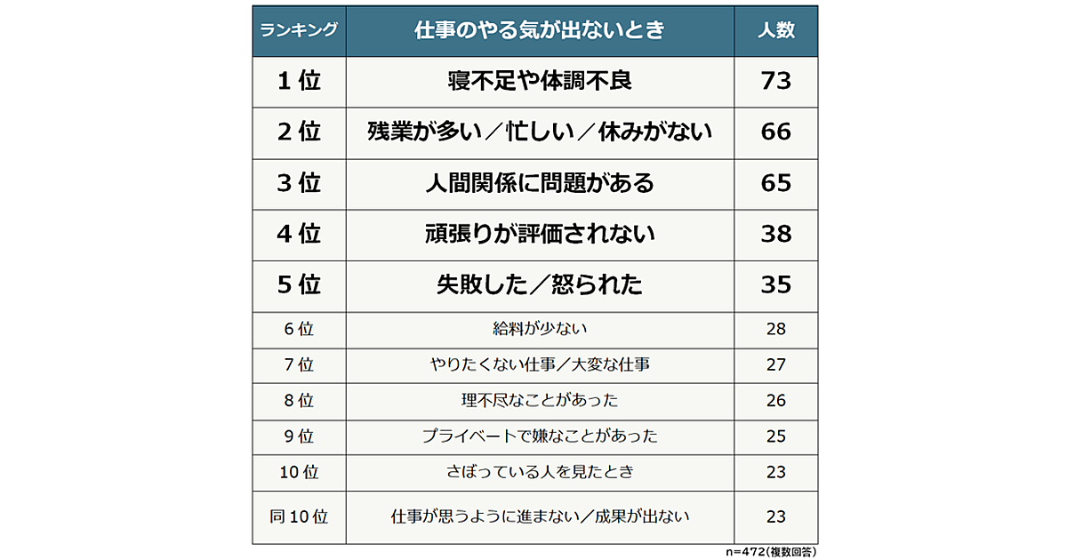 そこで「仕事のやる気が出ないときがある」と回答した472人に「どういったときに、仕事のやる気が出ないか?」を聞くと、「寝不足や体調不良」73人がトップ。以下「残業が多い/忙しい/休みがない」66人、「人間関係に問題がある」65人に票が集まった。「寝不足や体調不良」については、慢性的な体調不良のほか、飲み過ぎや生理などをあげる人が少なくなかった。