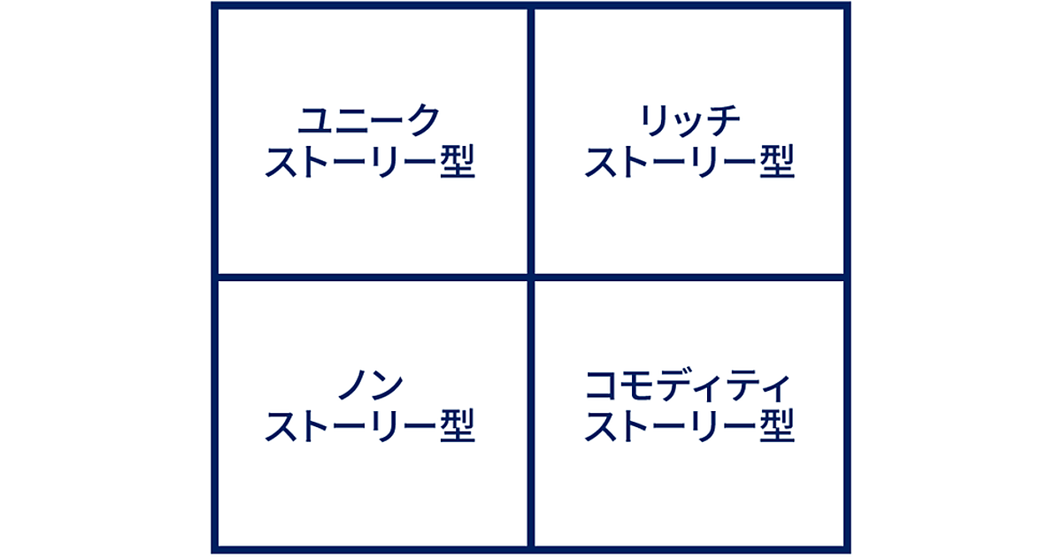 コモディティストーリー型よりもワード数が多く、個性的な文脈が見られる一方で、ネガティブなワードや文脈が見られる場合がある。全ての行動意向が非常に低い。