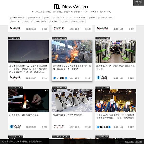 NewsVideoは、朝日、産経、毎日の各新聞社のニュース動画を一覧して視聴できるサイト。事件・事故、まちの話題などのニュース動画を掲載する。同じ事件や事故でも社によって取材や編集の仕方が異なり、動画の内容が変わる。比較したり3社の動画を一気に見たりすることで、テレビのニュース映像とは違った切り口で楽しめる。毎日30~40本の新着ニュースが見られる。