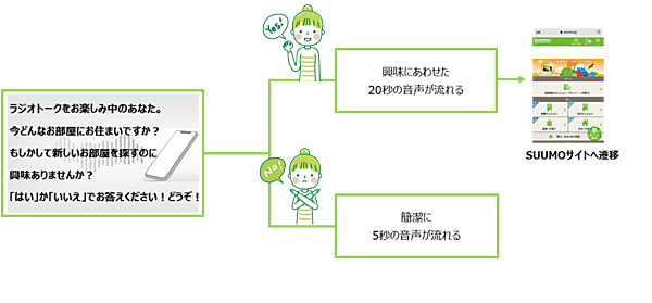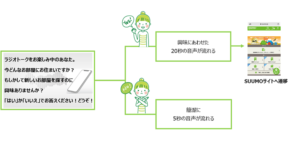 音声配信プラットフォーム事業のRadiotalkと、総合メディア事業の博報堂DYメディアパートナーズは、Radiotalkの音声配信サービス「Radiotalk」でリスナーと広告主が音声のやり取りでコミュニケーションできる広告システム「インタラクティブ(双方向)音声広告」の配信を始める、と1月27日発表した。第1弾で不動産・住宅情報サイト「SUUMO(スーモ)」の広告を実施する。