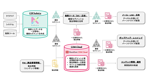 Legolissのカスタマイズ型CDP(カスタマーデータプラットフォーム)「kukuLu」と、ハートコアのデジタルエクスペリエンスプラットフォーム「HeartCore CXM Cloud」を連携させる。CDPは顧客それぞれの属性データを収集・蓄積・統合するプラットフォーム。kukuLuは企業の保有データや目的によって機能がカスタマイズできることを特長にしている。