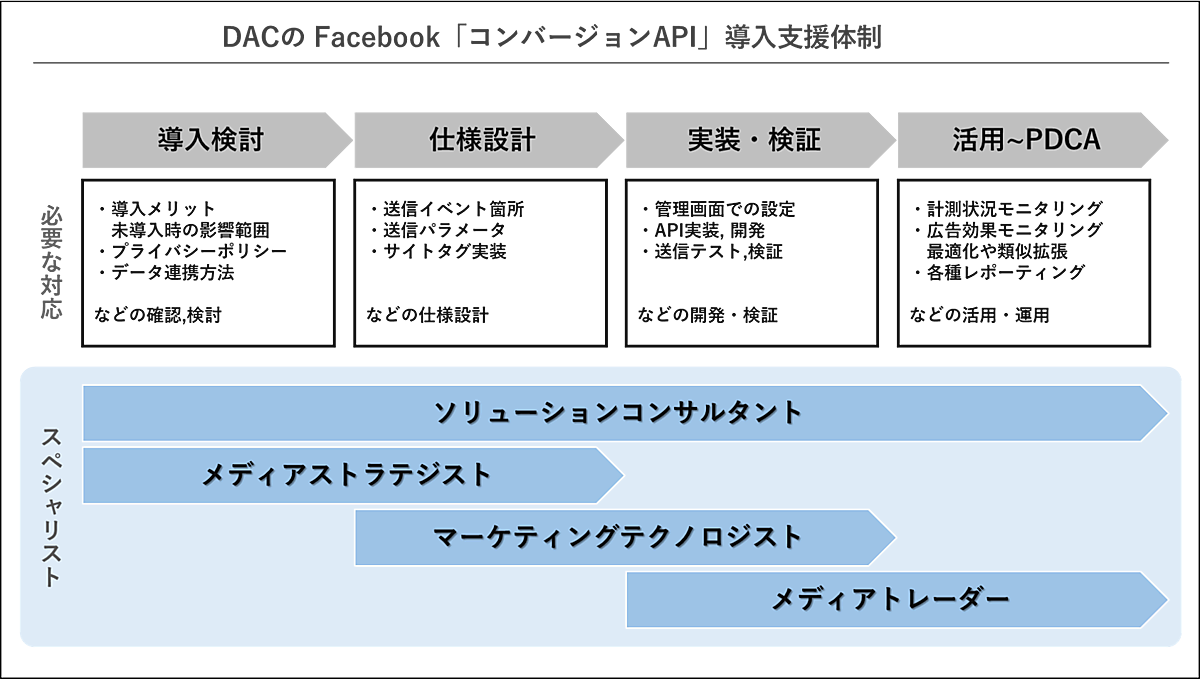 DACはこれまでもコンバージョンAPIの実装サービスを提供していたが今回、ソリューションコンサルタント▽メディアストラテジスト▽マーケティングテクノロジスト▽メディアトレーダー--といった社内のスペシャリストによる支援体制を構築。迅速で細やかなトータルサーポートを実現した。DACは、Facebookの「Facebook Marketing Partner」に認定されている。