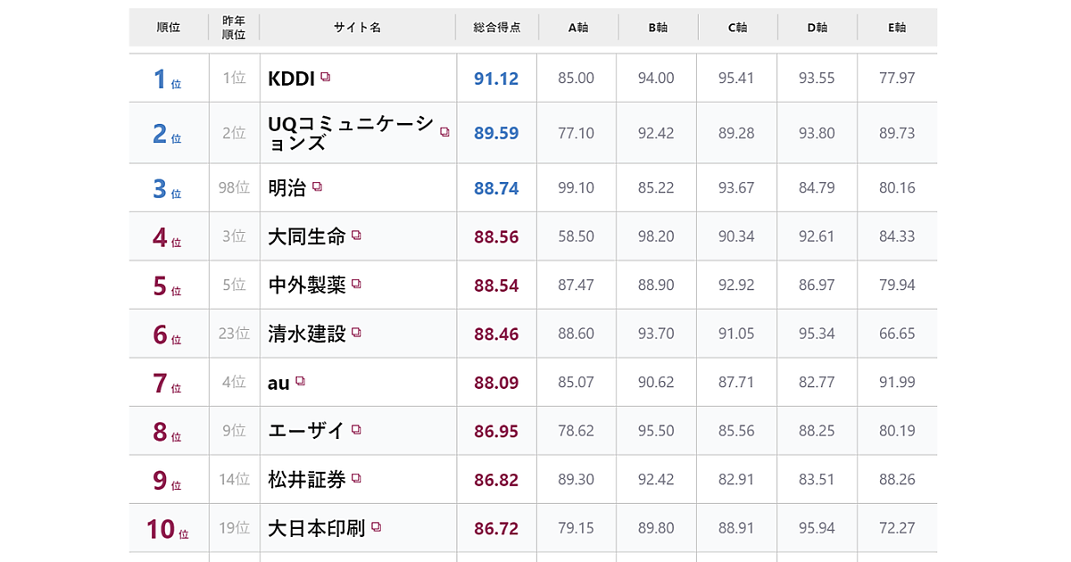今回のランキングは、1位「KDDI」、2位「UQコミュニケーションズ」、3位「明治」、4位「大同生命」、5位「中外製薬」となった。前年2020年は1位~5位の企業の顔ぶれに変動はなかったが、今回前年98位の明治が3位にまでジャンプアップした。