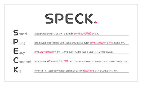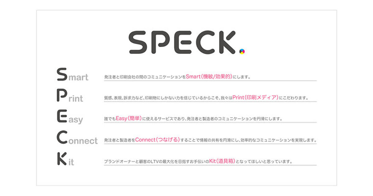 印刷物にデジタルと同等のスピードと使いやすさの力を与えるサービス実現の第一歩としてSPECK.pressを展開する。同社が10数年以上請け負ってきた紙のダイレクトメールは、紙でしか実現できない表現方法と高い訴求力がある優秀な販促媒体だが、さまざまな作業が発生して出したいタイミングで施策を実行できなくなっていた。