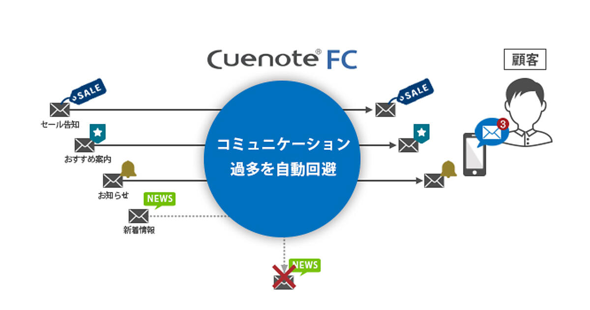 Cuenoteシリーズは、メール・SMS(ショートメッセージサービス)配信のソリューションで、クラウドサービスでフリークエンシー機能は標準機能で提供する。Cuenoteは独自開発のメール配信エンジンでメールやSMS配信を高速・確実に実行する。月間配信44億通は国内最大規模で、自治体や企業、団体などサービス契約数は1800超になる。