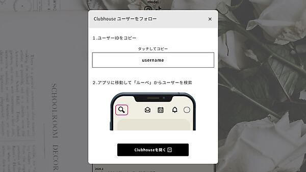 Clubhouseユーザーフォロー機能は、スマートフォンかPCで「Clubhouseフォローボタン」を設定する。lit.link画面上にフォロー用ボタンが表示され、クリックするとユーザーIDをコピーする画面とClubhouseアプリに移動するボタンが出現する。ガイダンス通りにIDをアプリ上の検索画面にペーストすると該当ユーザーを発見できる。