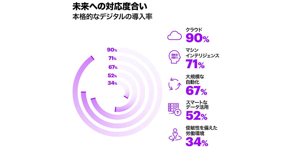 未来型企業の67%が首尾一貫したデジタルプロセスを構築しており、58%は最先端のテクノロジーを継続的に導入していた。ただし、自動化が成熟レベルに達している日本企業は8%に留まっているが、2023年には50%台まで増加する見込みだ。