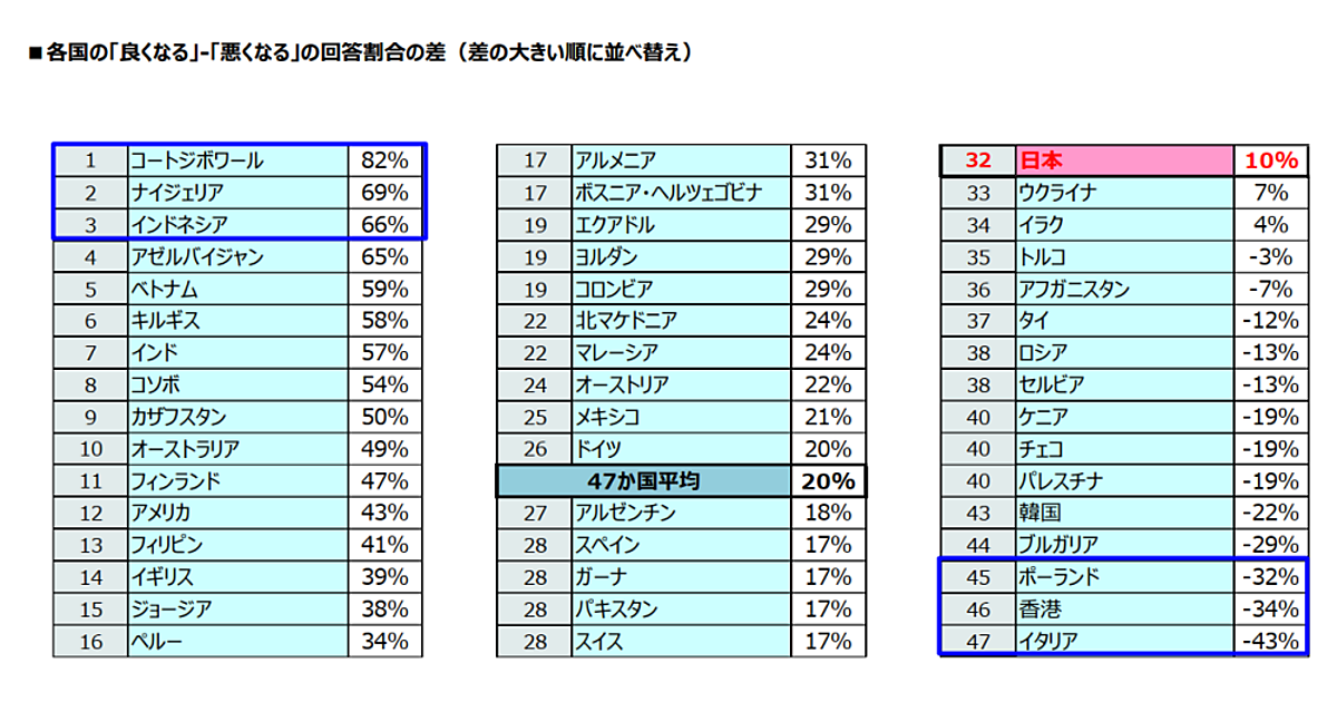 「良くなる-悪くなる」の差の大きい順で、日本は47か国中32位。上位3か国はコートジボワール、ナイジェリア、インドネシア。下位3か国は、イタリア、香港、ポーランドだった。