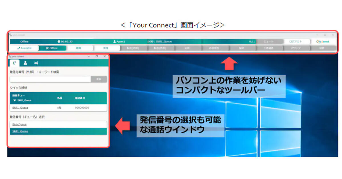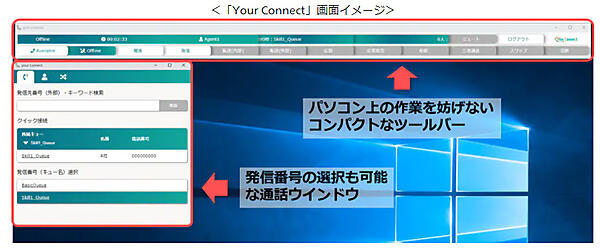 Your Connectは、PCとネットワーク環境があれば、リモートワークでも従来のコンタクトセンターと遜色のない業務ができる。発信番号選択や待ち呼数表示、問い合わせ内容表示など日本のコンタクトセンターで必要な機能を備えた。オペレーター目線の使いやすいデザインで、デスクトップを妨げないコンパクトなインターフェイスを実現した。