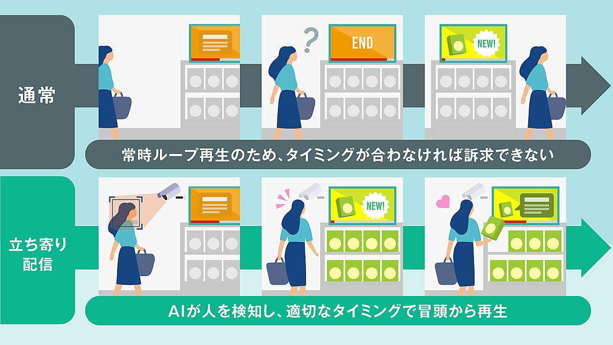 AIカメラでサイネージ前の通過数や滞在数、視聴数を計測して性別・年齢を属性分析する。可視化されたデータに基づいて、クリエイティブ(制作物)別の効果や視聴率と売上の相関性の分析結果を提供する。さらに来店客をAIカメラが感知してサイネージに接近したタイミングで広告配信して滞在率を向上させる「立ち寄り配信」ができる。商品棚の前を通過するタイミングで冒頭から配信を開始するので訴求内容を明確に伝えられる。