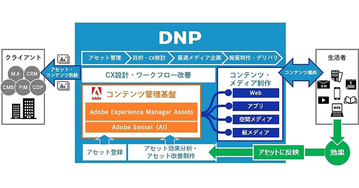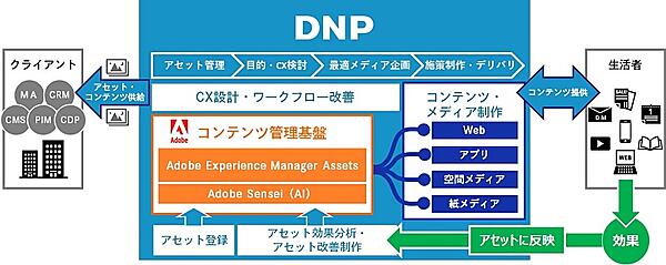 企業はマーケティングで生活者のニーズに合わせた各種コンテンツをタイミングよく訴求する必要がある。DCDは、2019年にAdobe Experience Manager Assetsを導入して各種アセットをいつでも活用できるよう一元管理して制作業務を効率化し、工程時間を25%短縮するノウハウを培ってきた。DNPとDCD、アドビは機能開発や実証実験を進めて7月からサービス提供を開始し、通販や小売・流通、メーカーへの導入を目指す。