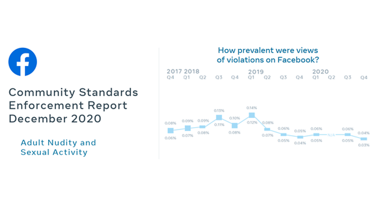 Facebookでは2020年第3四半期(7月~9月)に、初めて「ヘイトスピーチの表示頻度(プレヴァレンス)」を集計・公開。当時は「0.10%~0.11%」と算出していた。そして今四半期(10月~12月)については、「0.07%~0.08%」(コンテンツ閲覧1万件ごとに7~8件)に低下したという。「暴力的で過激なコンテンツ」の表示頻度も前回0.07%から0.05%に低下した。「成人のヌードと性的行為に関するコンテンツ」は0.05%~0.06%から0.03%~0.04%に低下している。