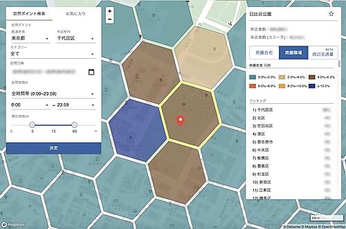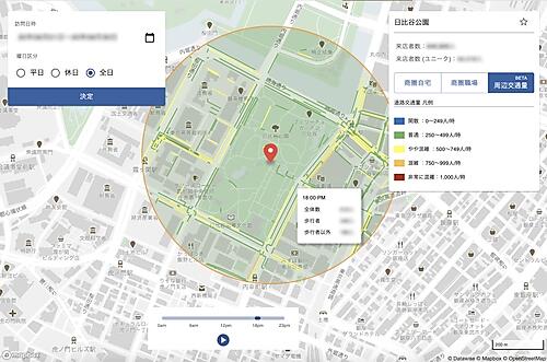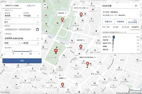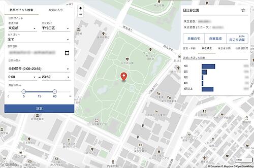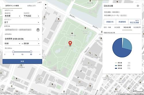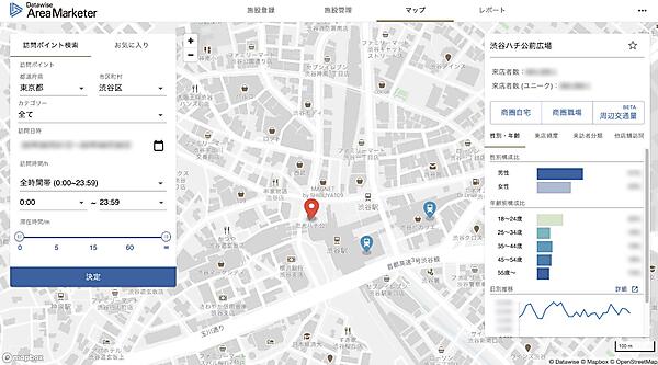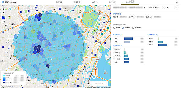 ドコモのポイントサービス「dポイントクラブアプリ」の位置情報と性別・年齢層などの会員情報を利用する。飲食店や小売店などは店舗来訪者の時間帯別数や属性が統計的に分かり、店舗ごとの利用者像(ペルソナ)作成や営業時間の最適化に生かせる。時間帯ごとにターゲット層が多く集まる地域を把握して新規出店地区選択にも役立てられる。