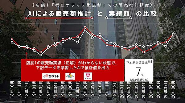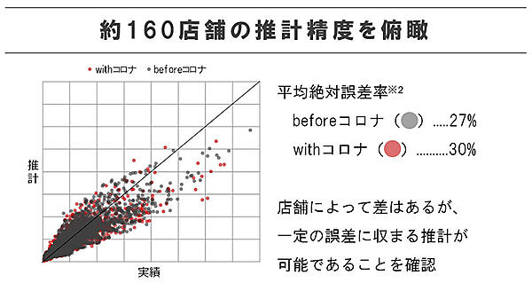モバイル空間統計は、いつ・どんな人が・どこから・どこへ・何人移動したかが分かる人口統計情報。インテージとDIMは2020年8月からデータ分析を行い、新型コロナウイルスの感染拡大に伴って店舗ごとの販売額が大きく変化した期間でも、高い精度で店舗の販売額が推計できた。過去の販売データを保有していない各店舗の販売推計も高精度で可能なことを実証した。