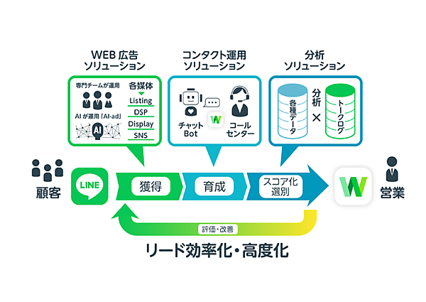 凸版印刷はさまざまな業界でマーケティング活動のシナリオ開発、施策実行、評価・改善を実施してきた。新たなサービスでは、このノウハウを活用してLINE WORKSでリードの効率化・高度化をサポートする。LINE WORKSの販売に加え、ウェブ広告運用、コンタクト運用、分析の各ソリューションと連携したサービスを提供。リードの獲得、育成、スコア化・選別を手掛ける。