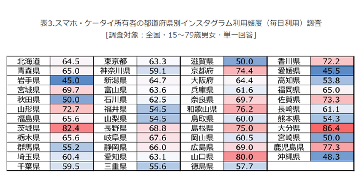 インスタを毎日利用してる上位は「大分県」「茨城県」「山口県」