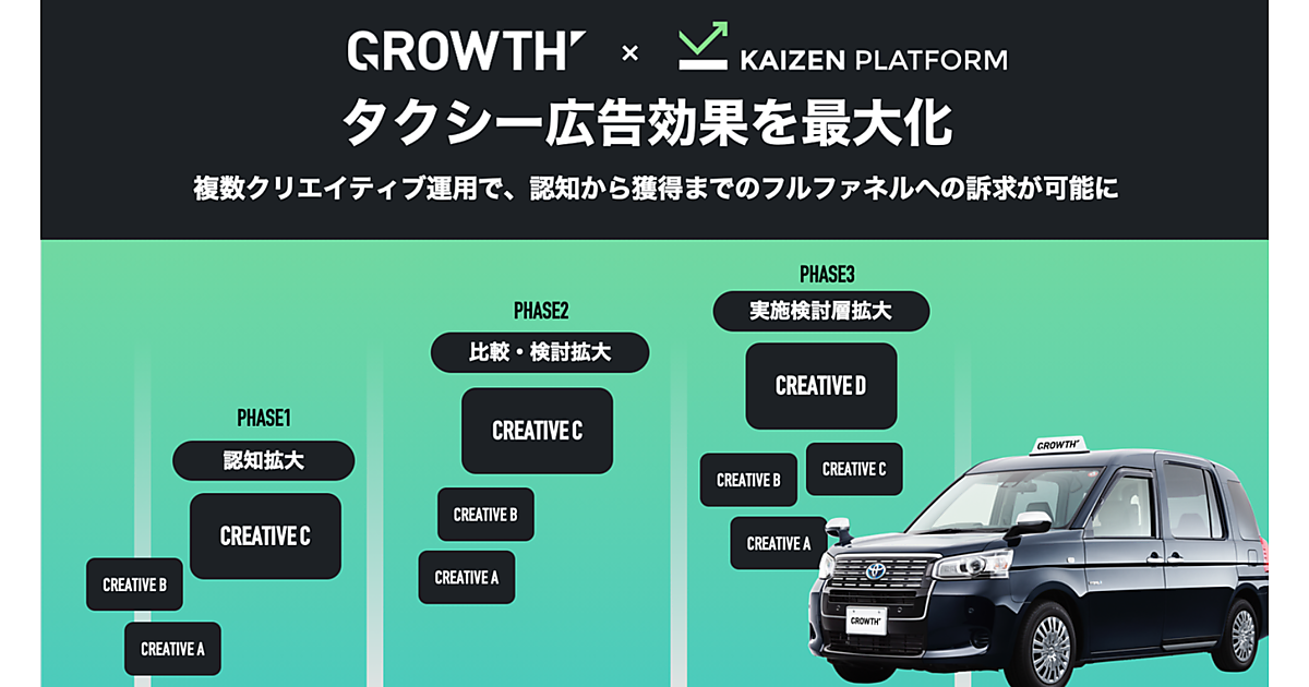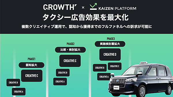 DX(デジタルトランスフォーメーション)・UX(ユーザー体験)・動画ソリューション事業のKaizen Platformは、タクシー内メディア「THE TOKYO TAXI VISION GROWTH」で配信する動画広告の効果最大化のためのパッケージプランの提供を3月11日に始めた、と同日発表した。GROWTHを展開するコンテンツ制作・サイネージ事業のニューステクノロジーと業務提携した。