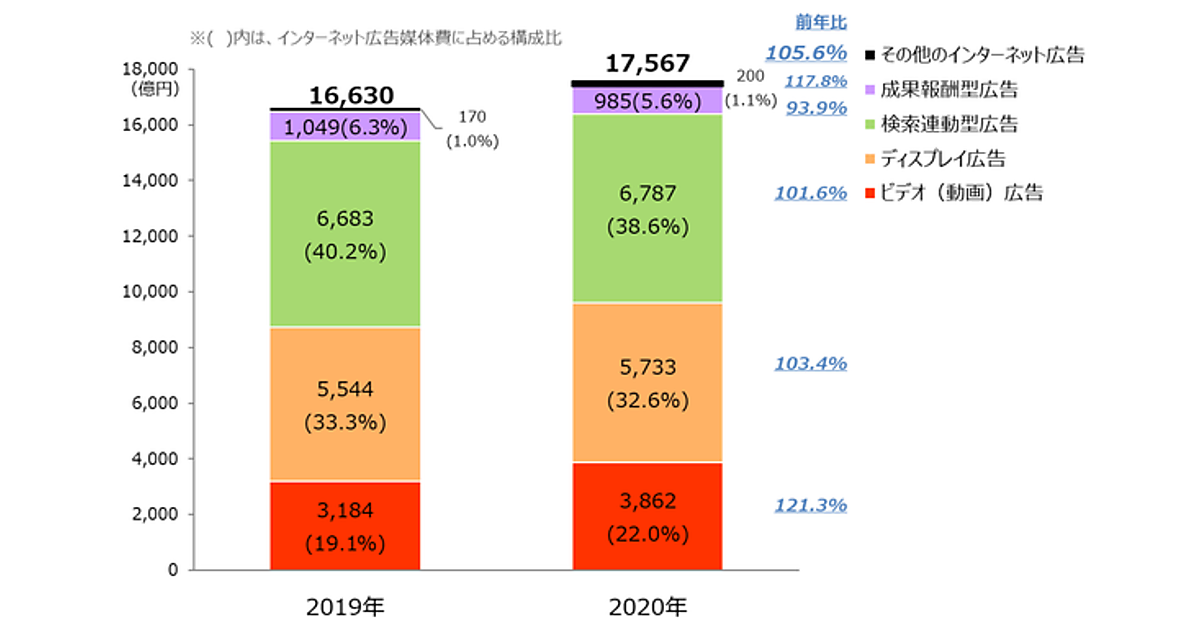 「インターネット広告費」から「インターネット広告制作費」および「物販系ECプラットフォーム広告費」を除いた「インターネット広告媒体費」は1兆7,567億円。広告種別でその構成比を見ると、検索連動型広告が6,787億円(38.6%)と最多ながら、シェア自体は減少。一方でビデオ(動画)広告が前年比121.3%の3,862億円(22.0%)と躍進した。なおビデオ(動画)広告の内訳は、インストリーム広告46.6%、アウトストリーム広告53.4%と推定されている。