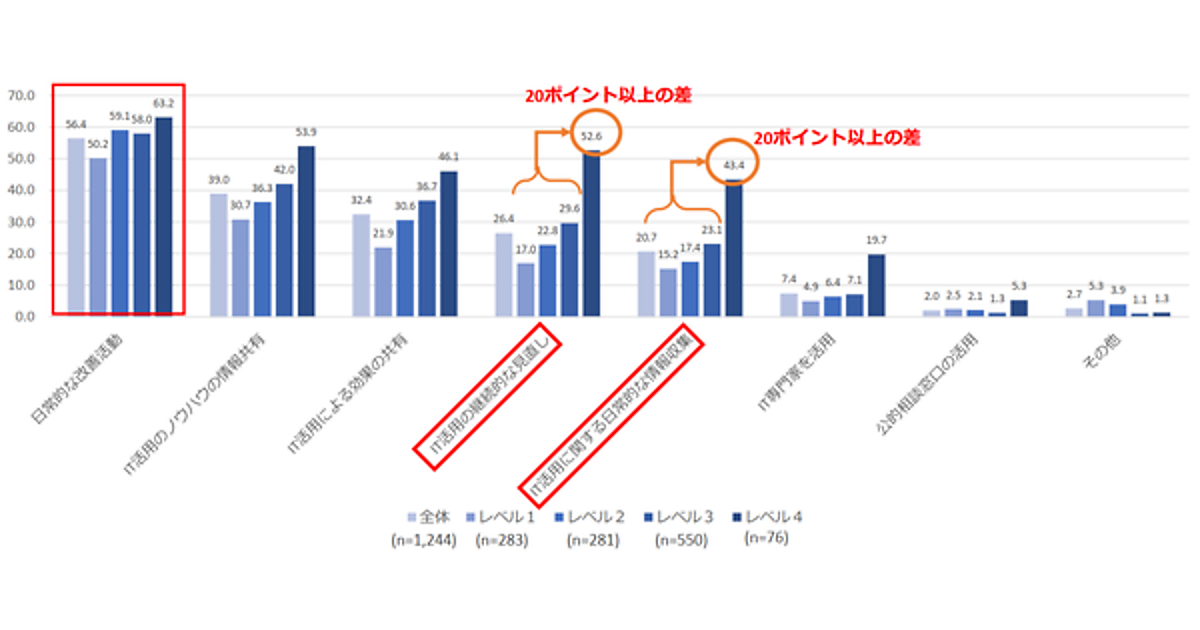 「ITの定着に向けた取り組み」では、すべてのレベルで「日常的な改善活動」が最多。相対的な差では、「IT活用の継続的な見直し」「IT活用に関する日常的な情報収集」を、高レベルの企業ほど重視していた。