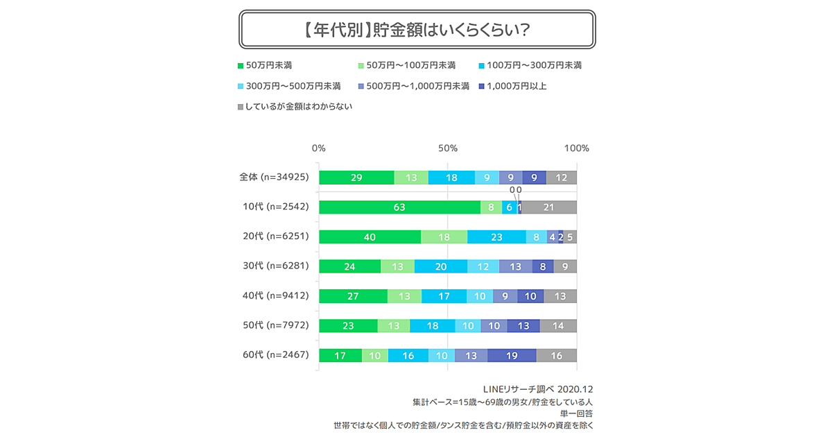 LINEの調査サービス「LINEリサーチ」は、全国の15~69歳男女約56万人を対象に「貯金と資産形成」について調査した結果を発表した。調査時期は2020年12月21日~12月25日で、有効回答からランダム抽出した4万8,648人が対象。2019年12月に実施した同種調査との比較を行っている。