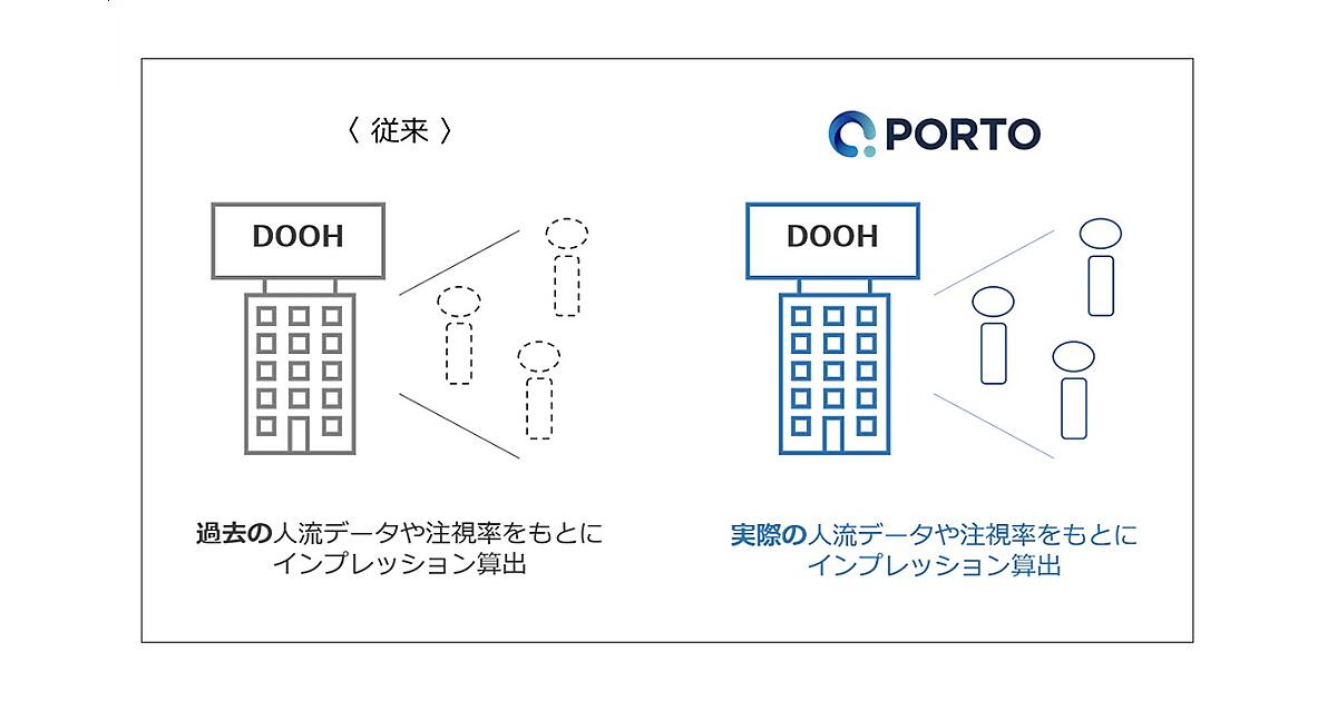 インターネット広告事業のCARTA HOLDINGS(カルタホールディングス)グループでブランド広告プラットフォーム「PORTO(ポルト)」を運営するPORTOは、DOOH(デジタル屋外)広告の「PORTO Premium DOOH」で配信時のアクチュアルデータ(実現値)を活用し、実際の人流データや注視率にもとづくインプレッション(表示回数)に応じた課金が3月から可能になった、と3月16日に発表した。より実態に沿った屋外広告を展開できる。