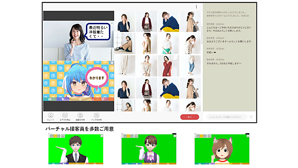 遠隔地のオフィスや自宅から自分の動きにバーチャルキャラクターを同期させ、店舗でディスプレーを見ている顧客を接客する。従来はVRゴーグルとコントローラーを装着して操作していたが、VR/AR(拡張現実)活用コンサルティングのキッズプレートと連携して、カメラで人の表情を読み取るフェイストラッキングとキーボード操作だけでシンクロできるようにした。操作が容易になり動作にエンターテイメント性を高めた演出もできる。