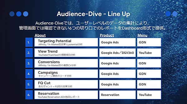 Audience Diveは、Googleが提供するユーザープライバシーに配慮したクラウドベースの分析基盤「Ads Data Hub」を活用する。性別年齢や地域、興味関心、購買意向のターゲティングセグメントごとの広告効果を事後分析し、事前に想定していなかった埋もれたユーザーをあぶり出せる。ダッシュボードで提供されるレポートのデータは全てデータウェアハウスに置かれ、定期的なデータ更新と柔軟なカスタマイズに対応する。